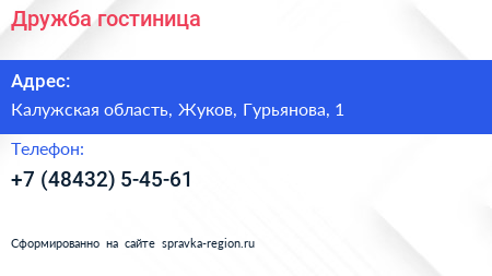 Дружба, гостиница по адресу Калужская область, Жуков, Гурьянова, 1 в дальнейшем Организация, размещена в следующих категориях: