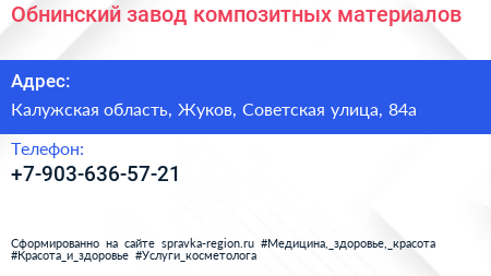 Обнинский завод композитных материалов по адресу Калужская область, Жуков, Советская улица, 84а в дальнейшем Организация, размещена в следующих категориях: