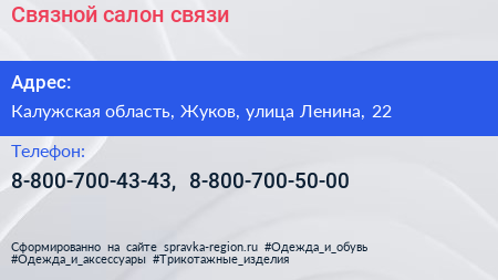 Связной, салон связи по адресу Калужская область, Жуков, улица Ленина, 22 в дальнейшем Организация, размещена в следующих категориях: