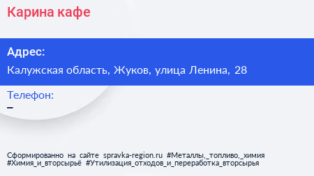 Карина, кафе по адресу Калужская область, Жуков, улица Ленина, 28 в дальнейшем Организация, размещена в следующих категориях:
