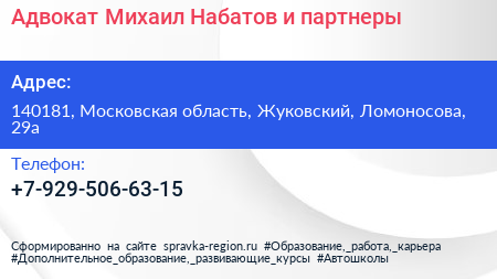 Адвокат Михаил Набатов и партнеры по адресу 140181, Московская область, Жуковский, Ломоносова, 29а в дальнейшем Организация, размещена в следующих категориях: