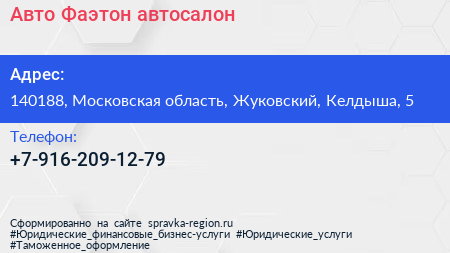 Авто Фаэтон, автосалон по адресу 140188, Московская область, Жуковский, Келдыша, 5 в дальнейшем Организация, размещена в следующих категориях: