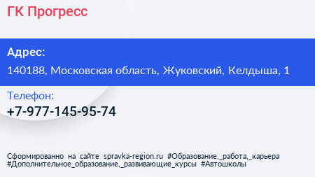 ГК Прогресс по адресу 140188, Московская область, Жуковский, Келдыша, 1 в дальнейшем Организация, размещена в следующих категориях: