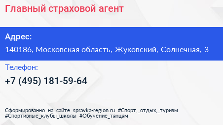 Главный страховой агент по адресу 140186, Московская область, Жуковский, Солнечная, 3 в дальнейшем Организация, размещена в следующих категориях: