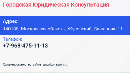 Городская Юридическая Консультация по адресу 140188, Московская область, Жуковский, Баженова, 11 в дальнейшем Организация, размещена в следующих категориях: