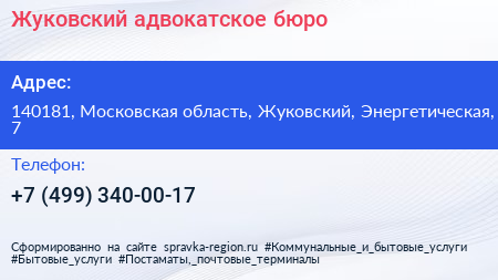Жуковский, адвокатское бюро по адресу 140181, Московская область, Жуковский, Энергетическая, 7 в дальнейшем Организация, размещена в следующих категориях: