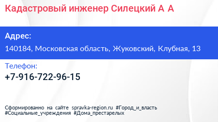 Кадастровый инженер Силецкий А.А. по адресу 140184, Московская область, Жуковский, Клубная, 13 в дальнейшем Организация, размещена в следующих категориях: