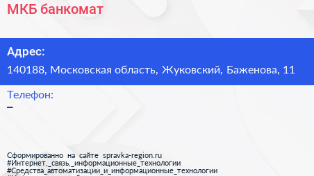 МКБ, банкомат по адресу 140188, Московская область, Жуковский, Баженова, 11 в дальнейшем Организация, размещена в следующих категориях: