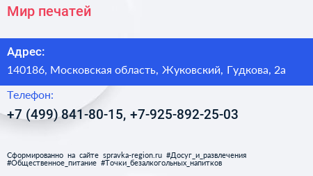Мир печатей по адресу 140186, Московская область, Жуковский, Гудкова, 2а в дальнейшем Организация, размещена в следующих категориях: