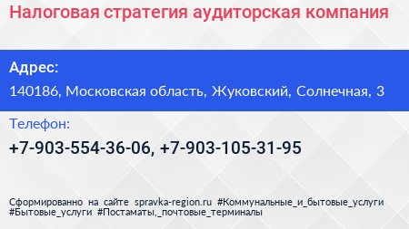 Налоговая стратегия, аудиторская компания по адресу 140186, Московская область, Жуковский, Солнечная, 3 в дальнейшем Организация, размещена в следующих категориях: