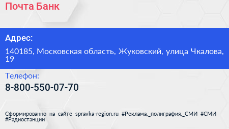 Почта Банк по адресу 140185, Московская область, Жуковский, улица Чкалова, 19 в дальнейшем Организация, размещена в следующих категориях: