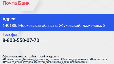 Почта Банк по адресу 140188, Московская область, Жуковский, Баженова, 3 в дальнейшем Организация, размещена в следующих категориях:
