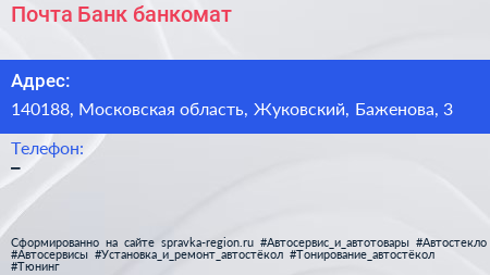 Почта Банк, банкомат по адресу 140188, Московская область, Жуковский, Баженова, 3 в дальнейшем Организация, размещена в следующих категориях: