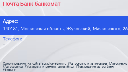 Почта Банк, банкомат по адресу 140181, Московская область, Жуковский, Маяковского, 26 в дальнейшем Организация, размещена в следующих категориях: