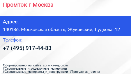 Промтэк, г. Москва по адресу 140186, Московская область, Жуковский, Гудкова, 12 в дальнейшем Организация, размещена в следующих категориях: