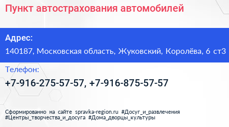 Пункт автострахования автомобилей по адресу 140187, Московская область, Жуковский, Королёва, 6 ст3 в дальнейшем Организация, размещена в следующих категориях: