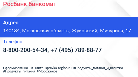 Росбанк, банкомат по адресу 140184, Московская область, Жуковский, Мичурина, 17 в дальнейшем Организация, размещена в следующих категориях: