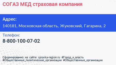 СОГАЗ-МЕД, страховая компания по адресу 140181, Московская область, Жуковский, Гагарина, 2 в дальнейшем Организация, размещена в следующих категориях: