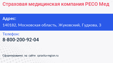 Страховая медицинская компания РЕСО-Мед по адресу 140182, Московская область, Жуковский, Гудкова, 3 в дальнейшем Организация, размещена в следующих категориях: