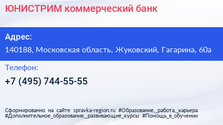 ЮНИСТРИМ, коммерческий банк по адресу 140188, Московская область, Жуковский, Гагарина, 60а в дальнейшем Организация, размещена в следующих категориях: