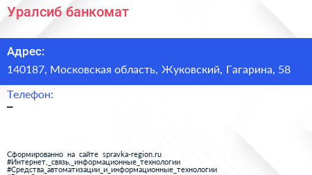 Уралсиб, банкомат по адресу 140187, Московская область, Жуковский, Гагарина, 58 в дальнейшем Организация, размещена в следующих категориях: