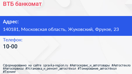 ВТБ, банкомат по адресу 140181, Московская область, Жуковский, Фрунзе, 23 в дальнейшем Организация, размещена в следующих категориях: