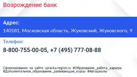 Возрождение, банк по адресу 140181, Московская область, Жуковский, Жуковского, 9 в дальнейшем Организация, размещена в следующих категориях: