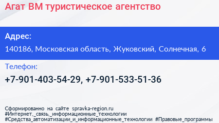 Агат-ВМ, туристическое агентство по адресу 140186, Московская область, Жуковский, Солнечная, 6 в дальнейшем Организация, размещена в следующих категориях: