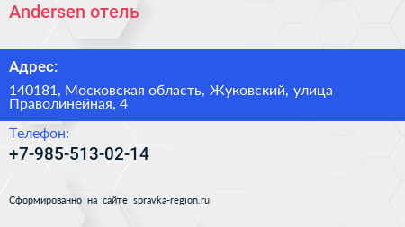 Andersen, отель по адресу 140181, Московская область, Жуковский, улица Праволинейная, 4 в дальнейшем Организация, размещена в следующих категориях: