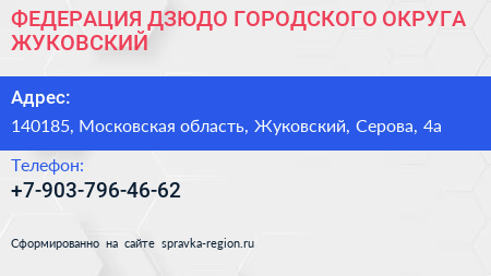 ФЕДЕРАЦИЯ ДЗЮДО ГОРОДСКОГО ОКРУГА ЖУКОВСКИЙ по адресу 140185, Московская область, Жуковский, Серова, 4а в дальнейшем Организация, размещена в следующих категориях: