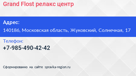 Grand Flost, релакс-центр по адресу 140186, Московская область, Жуковский, Солнечная, 17 в дальнейшем Организация, размещена в следующих категориях: