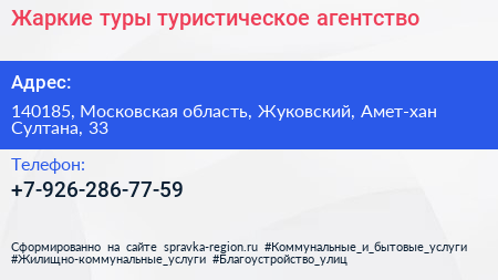 Жаркие туры, туристическое агентство по адресу 140185, Московская область, Жуковский, Амет-хан Султана, 33 в дальнейшем Организация, размещена в следующих категориях: