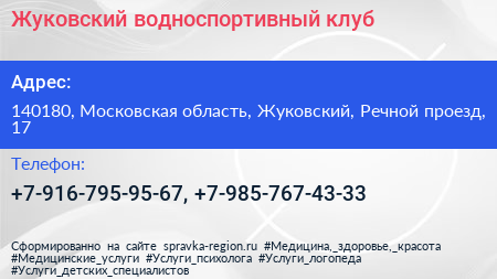 Жуковский водноспортивный клуб по адресу 140180, Московская область, Жуковский, Речной проезд, 17 в дальнейшем Организация, размещена в следующих категориях:
