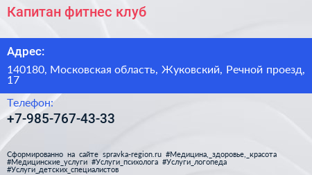 Капитан, фитнес-клуб по адресу 140180, Московская область, Жуковский, Речной проезд, 17 в дальнейшем Организация, размещена в следующих категориях: