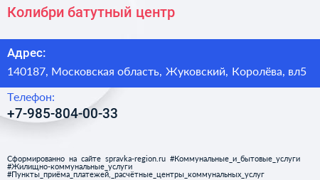 Колибри, батутный центр по адресу 140187, Московская область, Жуковский, Королёва, вл5 в дальнейшем Организация, размещена в следующих категориях: