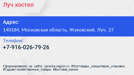 Луч, хостел по адресу 140184, Московская область, Жуковский, Луч, 27 в дальнейшем Организация, размещена в следующих категориях: