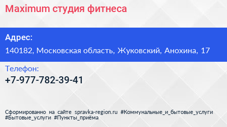 Maximum, студия фитнеса по адресу 140182, Московская область, Жуковский, Анохина, 17 в дальнейшем Организация, размещена в следующих категориях: