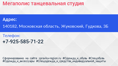 Мегаполис, танцевальная студия по адресу 140182, Московская область, Жуковский, Гудкова, 3Б в дальнейшем Организация, размещена в следующих категориях: