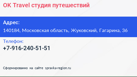 OK Travel, студия путешествий по адресу 140184, Московская область, Жуковский, Гагарина, 36 в дальнейшем Организация, размещена в следующих категориях:
