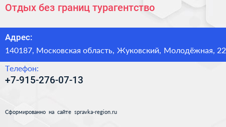 Отдых без границ, турагентство по адресу 140187, Московская область, Жуковский, Молодёжная, 22 в дальнейшем Организация, размещена в следующих категориях: