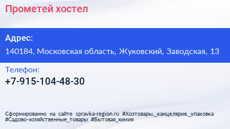 Прометей, хостел по адресу 140184, Московская область, Жуковский, Заводская, 13 в дальнейшем Организация, размещена в следующих категориях: