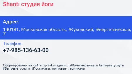 Shanti, студия йоги по адресу 140181, Московская область, Жуковский, Энергетическая, 7 в дальнейшем Организация, размещена в следующих категориях:
