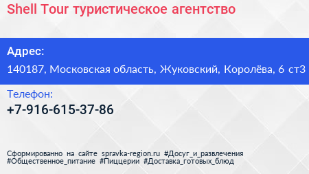 Shell Tour, туристическое агентство по адресу 140187, Московская область, Жуковский, Королёва, 6 ст3 в дальнейшем Организация, размещена в следующих категориях: