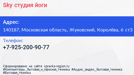 Sky, студия йоги по адресу 140187, Московская область, Жуковский, Королёва, 6 ст3 в дальнейшем Организация, размещена в следующих категориях: