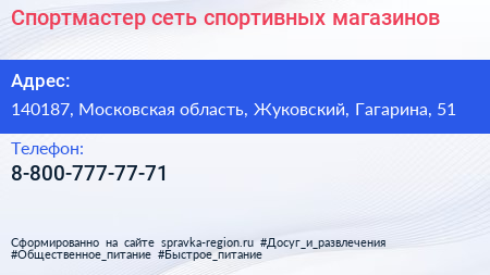 Спортмастер, сеть спортивных магазинов по адресу 140187, Московская область, Жуковский, Гагарина, 51 в дальнейшем Организация, размещена в следующих категориях: