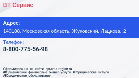 ВТ-Сервис по адресу 140188, Московская область, Жуковский, Лацкова, 2 в дальнейшем Организация, размещена в следующих категориях: