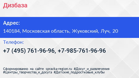 Дизбаза по адресу 140184, Московская область, Жуковский, Луч, 20 в дальнейшем Организация, размещена в следующих категориях: