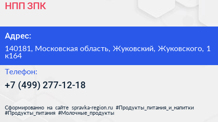 НПП ЗПК по адресу 140181, Московская область, Жуковский, Жуковского, 1 к164 в дальнейшем Организация, размещена в следующих категориях: