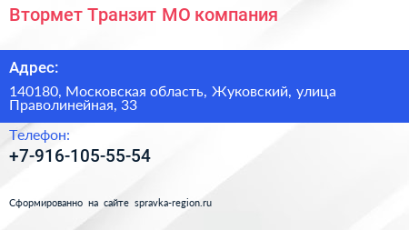 Втормет-Транзит МО, компания по адресу 140180, Московская область, Жуковский, улица Праволинейная, 33 в дальнейшем Организация, размещена в следующих категориях: