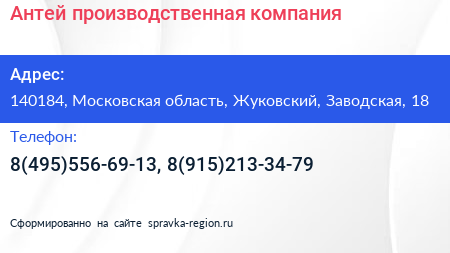 Антей, производственная компания по адресу 140184, Московская область, Жуковский, Заводская, 18 в дальнейшем Организация, размещена в следующих категориях: